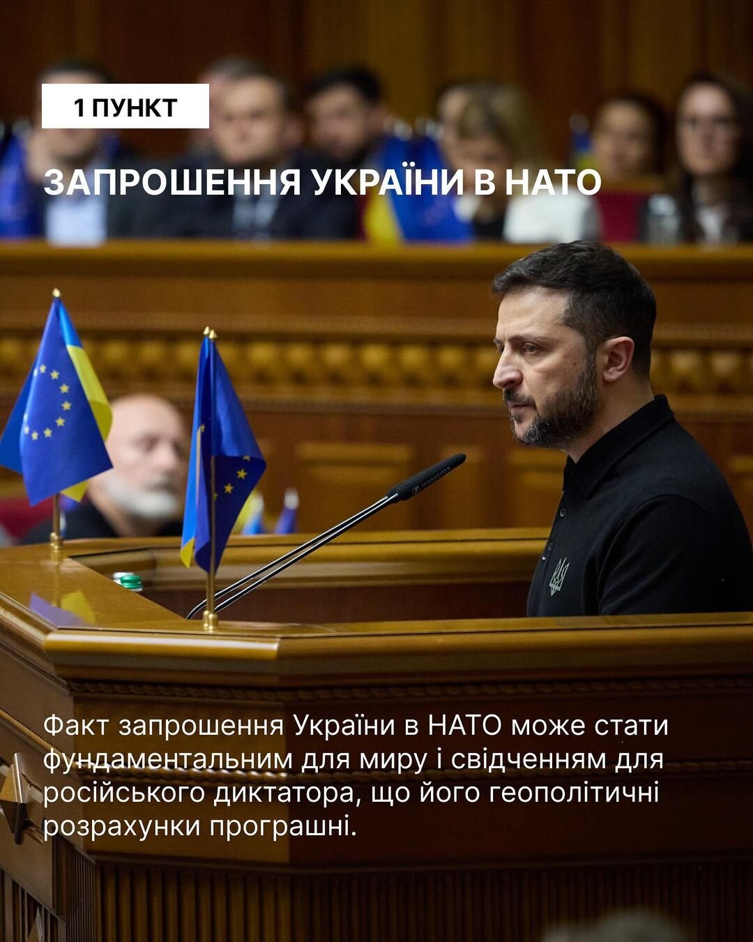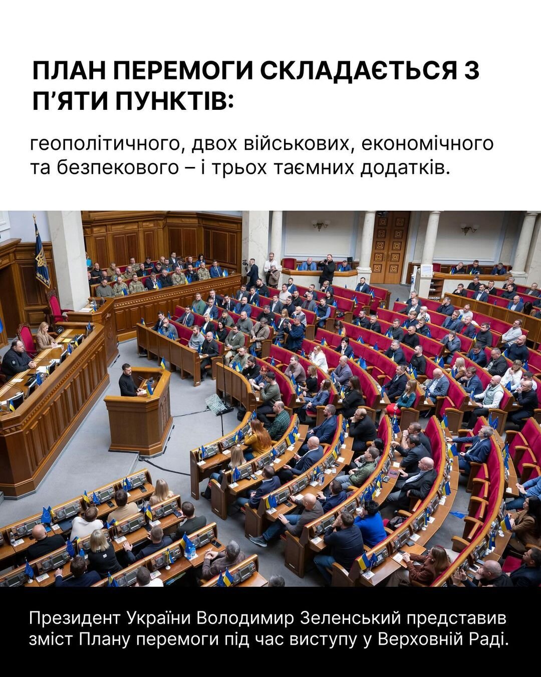 16 жовтня президент України Володимир Зеленський представив у Верховній Раді План Перемоги України. План складається із 5 пунктів (трьох таємних додатків) які репрезентує перелік заходів, які є результатом роботи великої команди для Переможного миру.