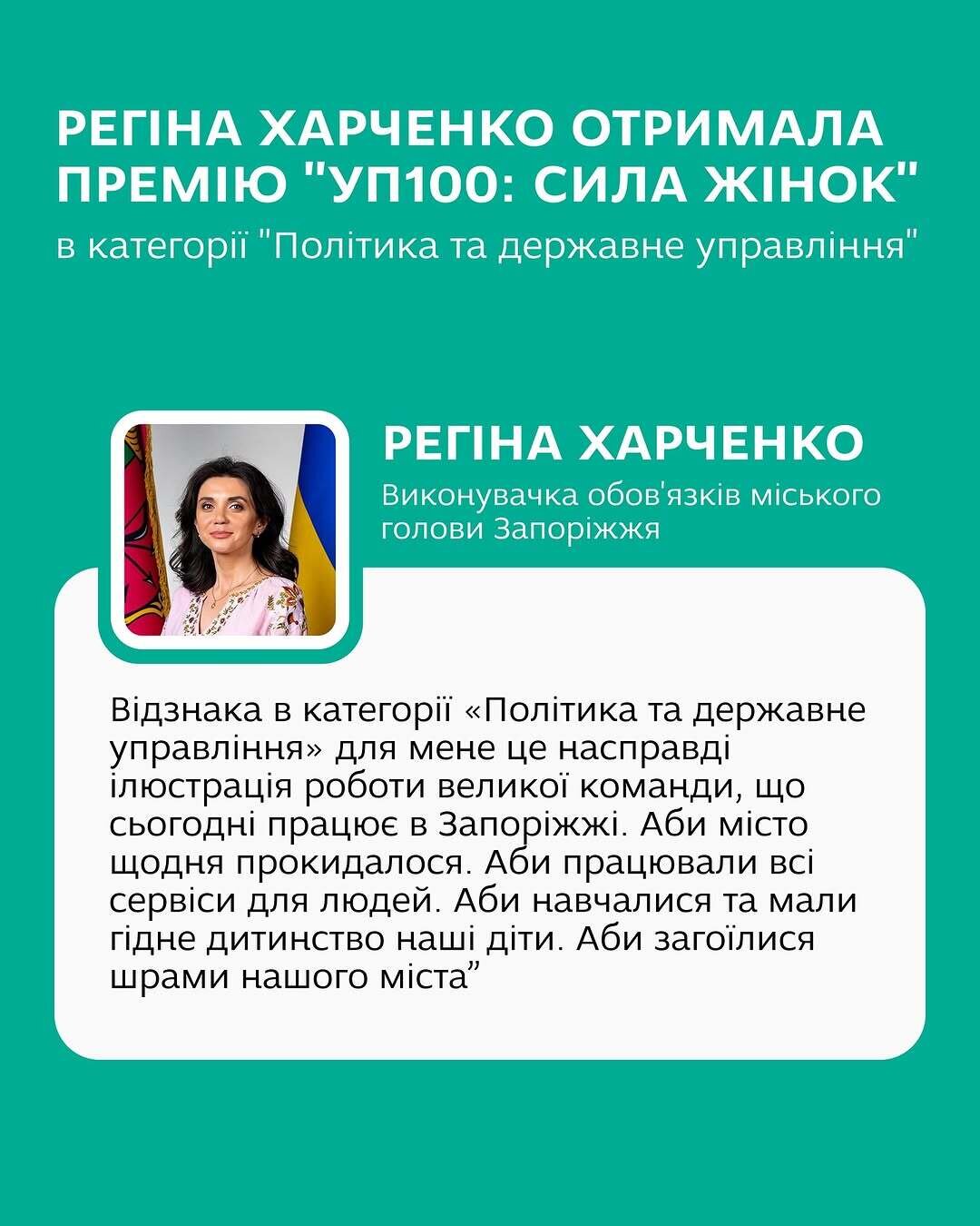 Зі ста українських лідерок, яких відзначили премією «Української правди 100. Сила жінок» журі обрало і виконувачку обов’язків міського голови Запоріжжя - Регіну Харченко.