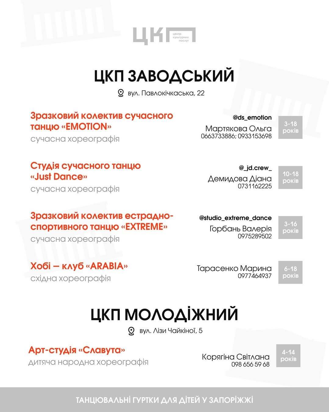 *на 4 картці одруківка: ЦКП Молодіжний знаходиться за адресою вулиця Лізи Чайкіної, 53