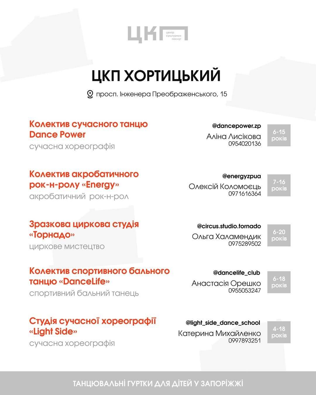 Усі деталі щодо занять дізнавайтесь у керівників. Їх контакти шукайте на картках.