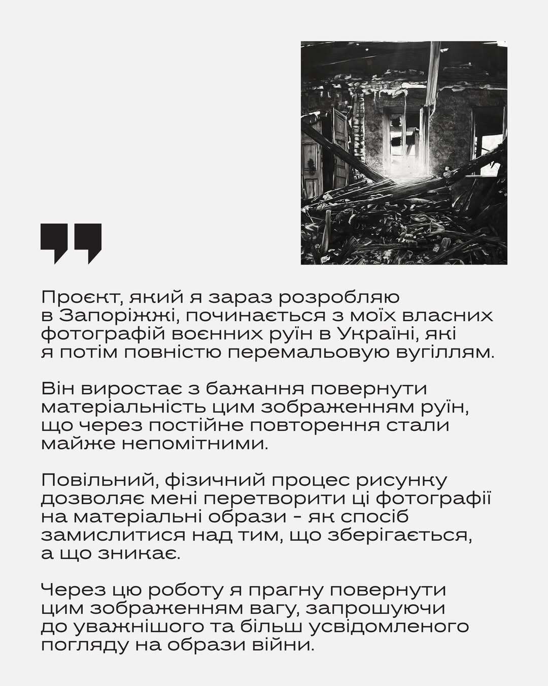 «Після мого досвіду в Україні моя практика набула нового напряму. Я дедалі більше переймалась перенасиченістю нашої візуальної культури - коли зображення війни безкінечно циркулюють у соцмережах, часто позбавлені контексту та емоційної глибини.