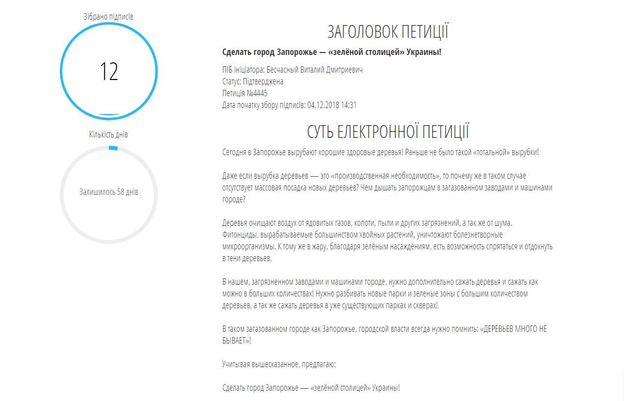 На думку автора петиції, Запоріжжю необхідні нові надсаждення дерев та нові зелені зони. Щоб дивізом нашого міста стало "дерев багато не буває", необхідно зібрати 750 підписів для перегляду справи.