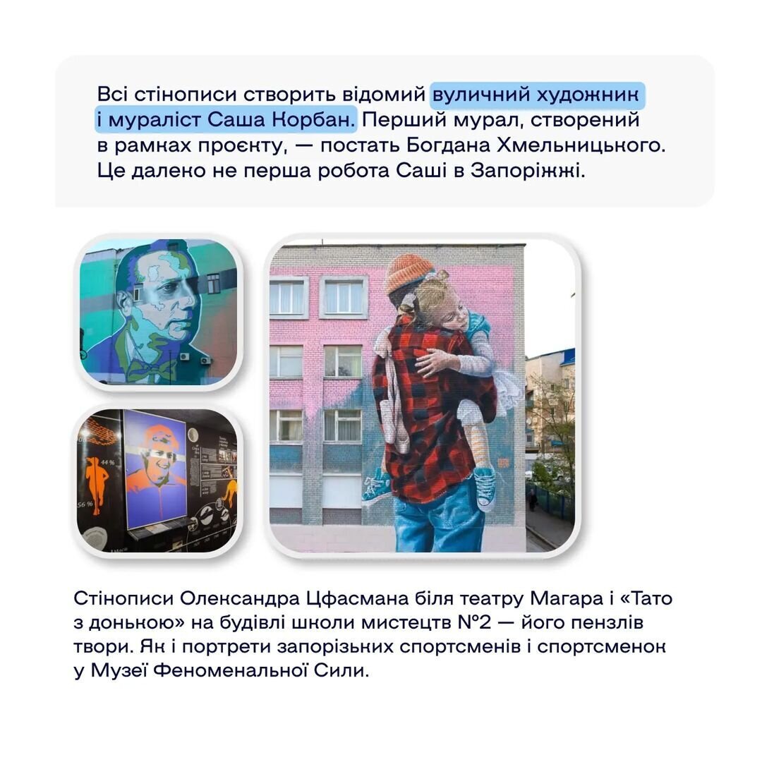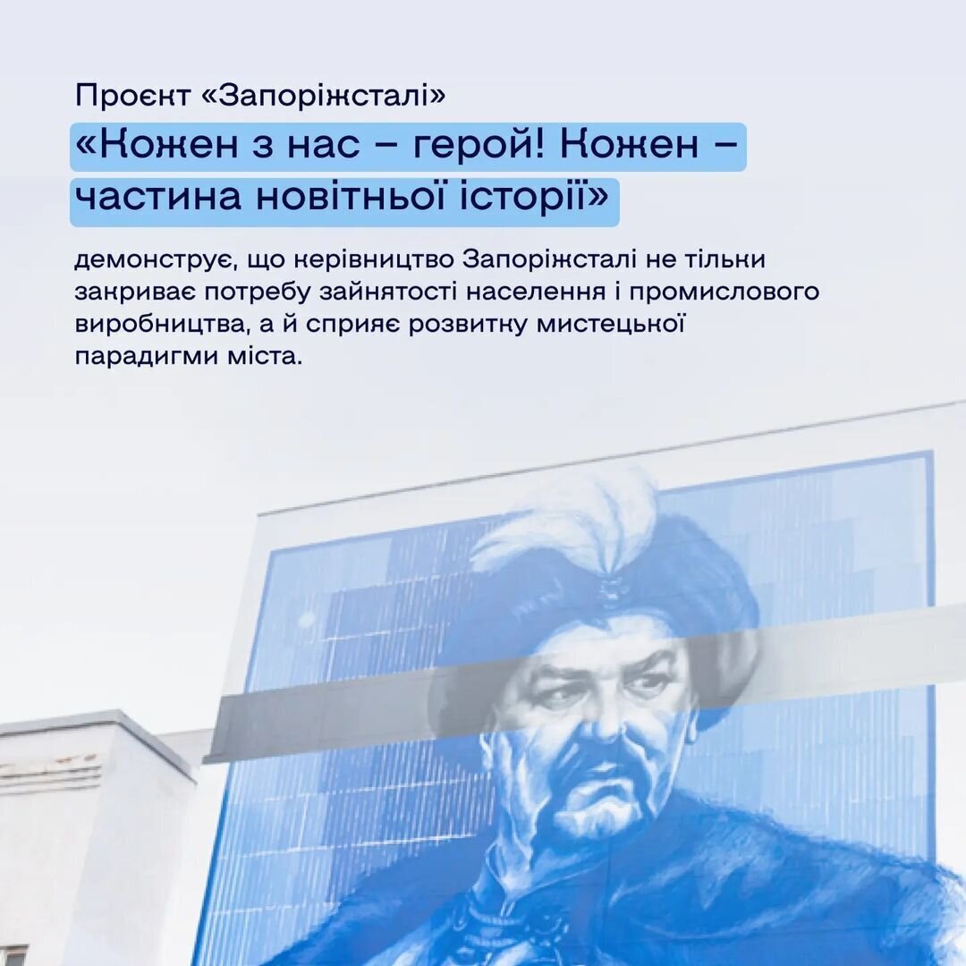 Стінописи від художника Саші Корбана @sasha.korban створять чіткий дзеркальний зв'язок між історичними постатями України та працівниками комбінату. Акцентують на тому, що наша нація, крізь роки історії, залишається героїчною. І весь колектив «Запоріжсталі» сьогодні — герої, які щоденно, невпинно та віддано працюють заради майбутнього.