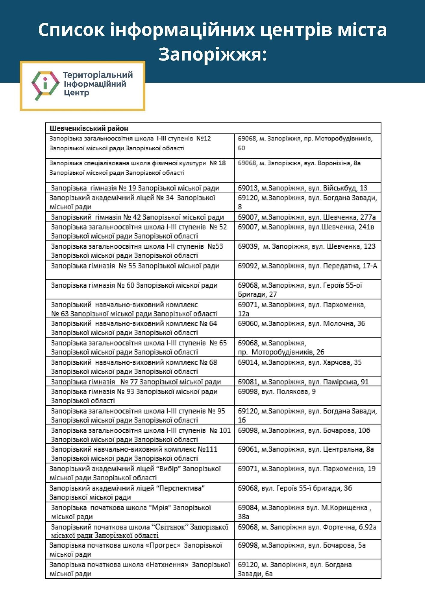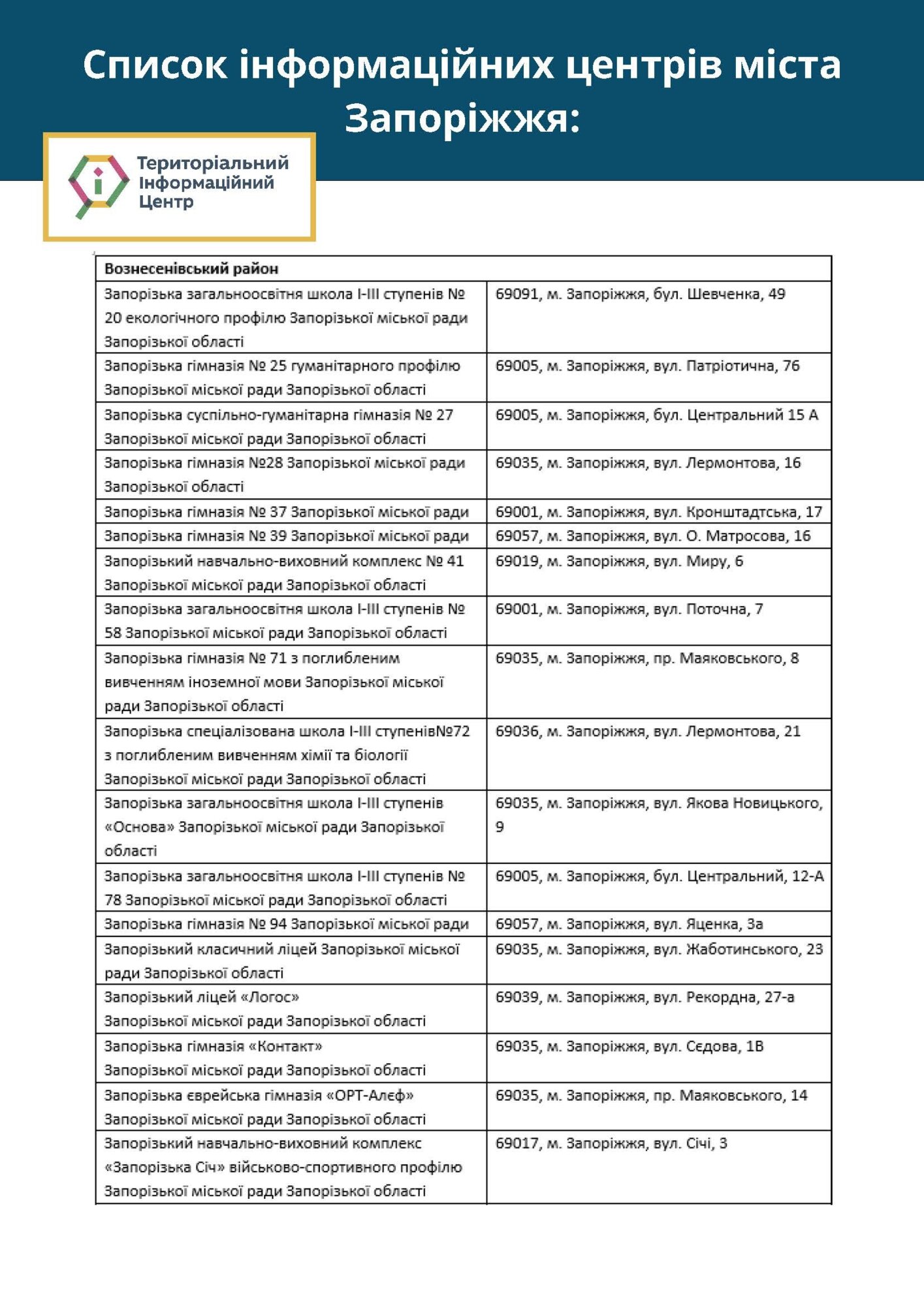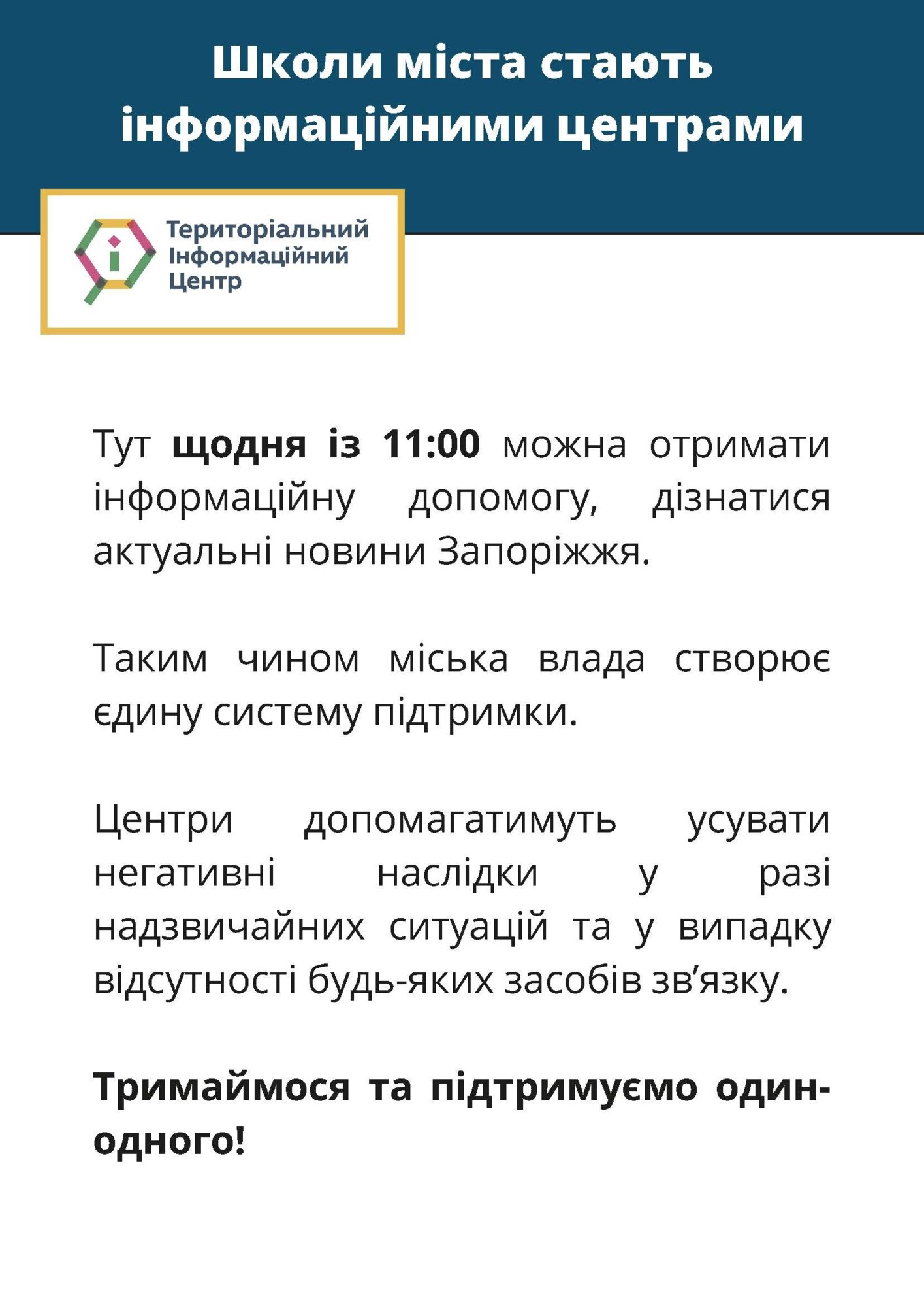 У місті вже розпочали свою роботу територіальні інформаційні центри, які створено на базі запорізьких шкіл. У цих центрах ви можете дізнатися про усі актуальні новини Запоріжжя.