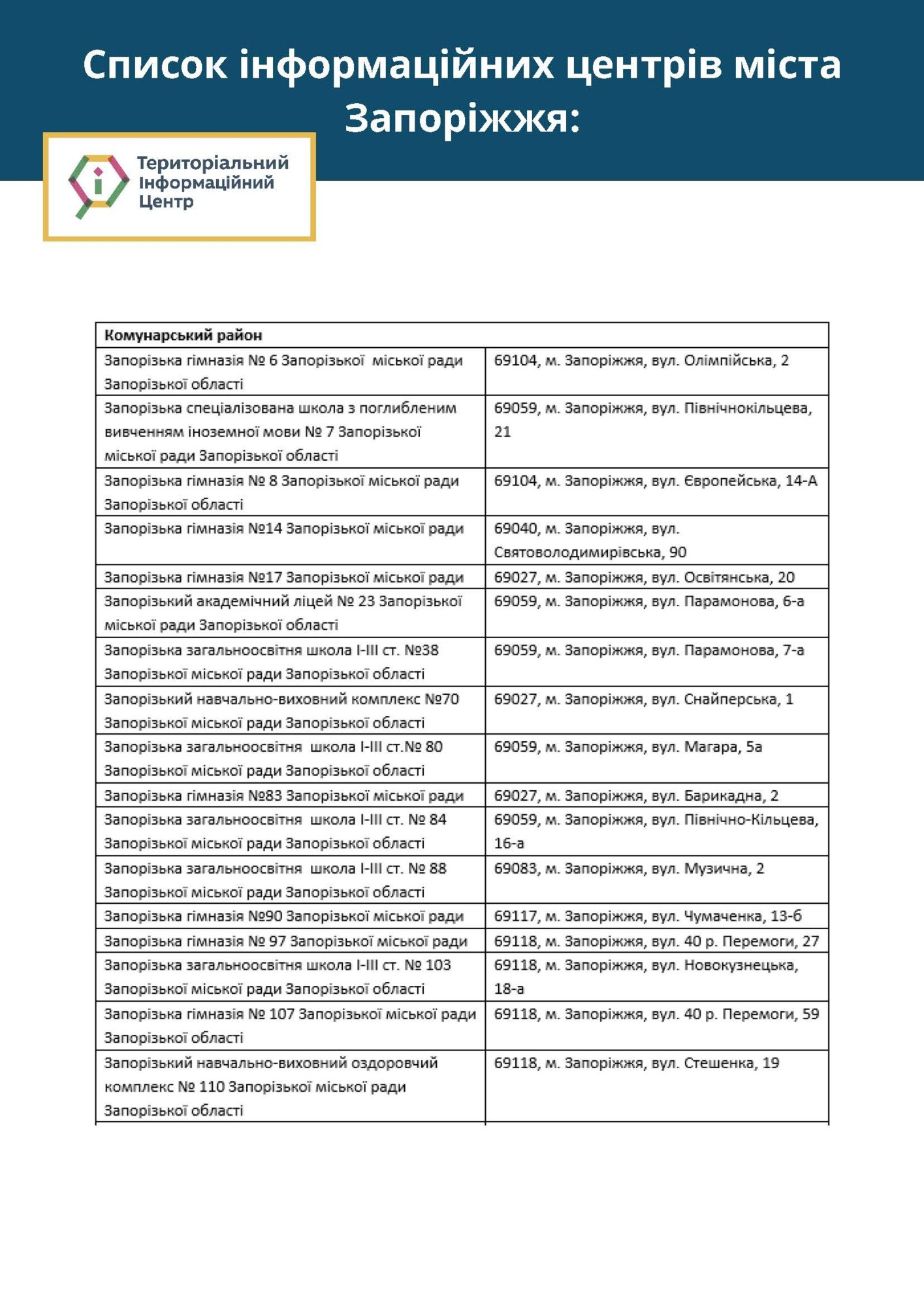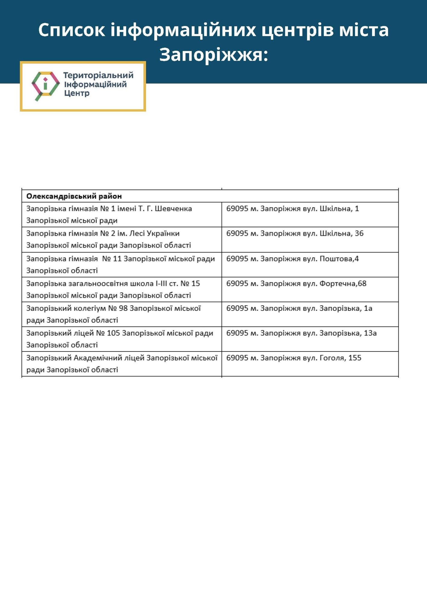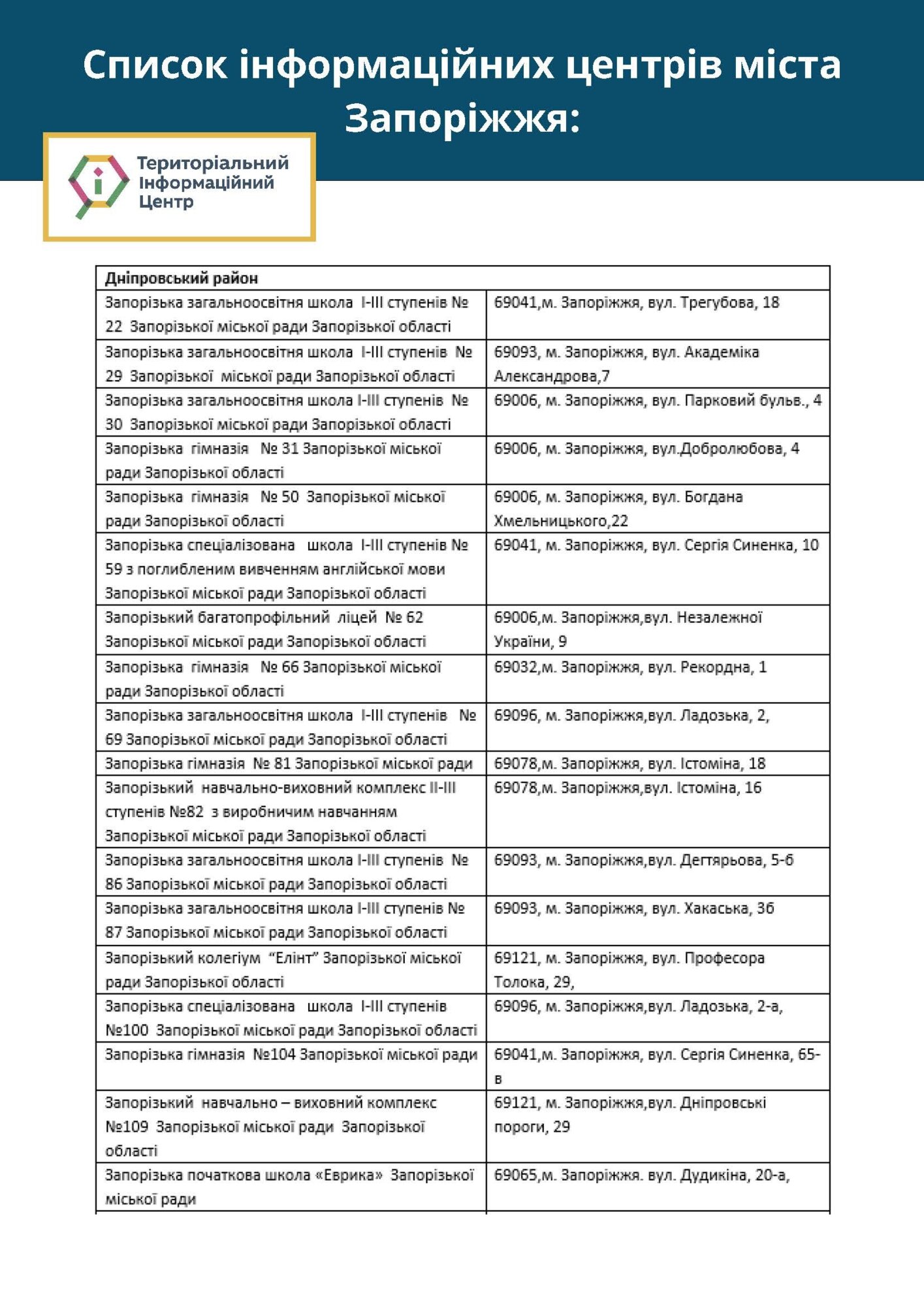 У місті вже розпочали свою роботу територіальні інформаційні центри, які створено на базі запорізьких шкіл. У цих центрах ви можете дізнатися про усі актуальні новини Запоріжжя.